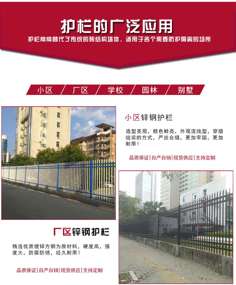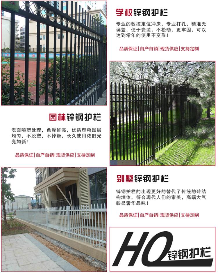 锌钢围栏也叫做锌合金栅栏,锌钢围栏或热镀锌围栏。缘故是采用锌钢型材作为原料,即热镀锌管材,将其冲压,削尖,腌制,磷化和经过十多道繁杂的工序,完成了美丽的锌钢栅栏产品,该产品简便大方,稳固结实,可以大大提高公司形象和工厂的防御能力。
